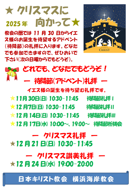 聖書[新共同訳]:イザヤ書8章23節後半~9章6節 説教:「救い主の誕生を“過去・現在・将来”から考える その1 過去から」 説教者:横浜海岸教会牧師 上山修平 讃美歌:229(1-3)、229(4-6)、244(1-3)、244(4,5)、24 |